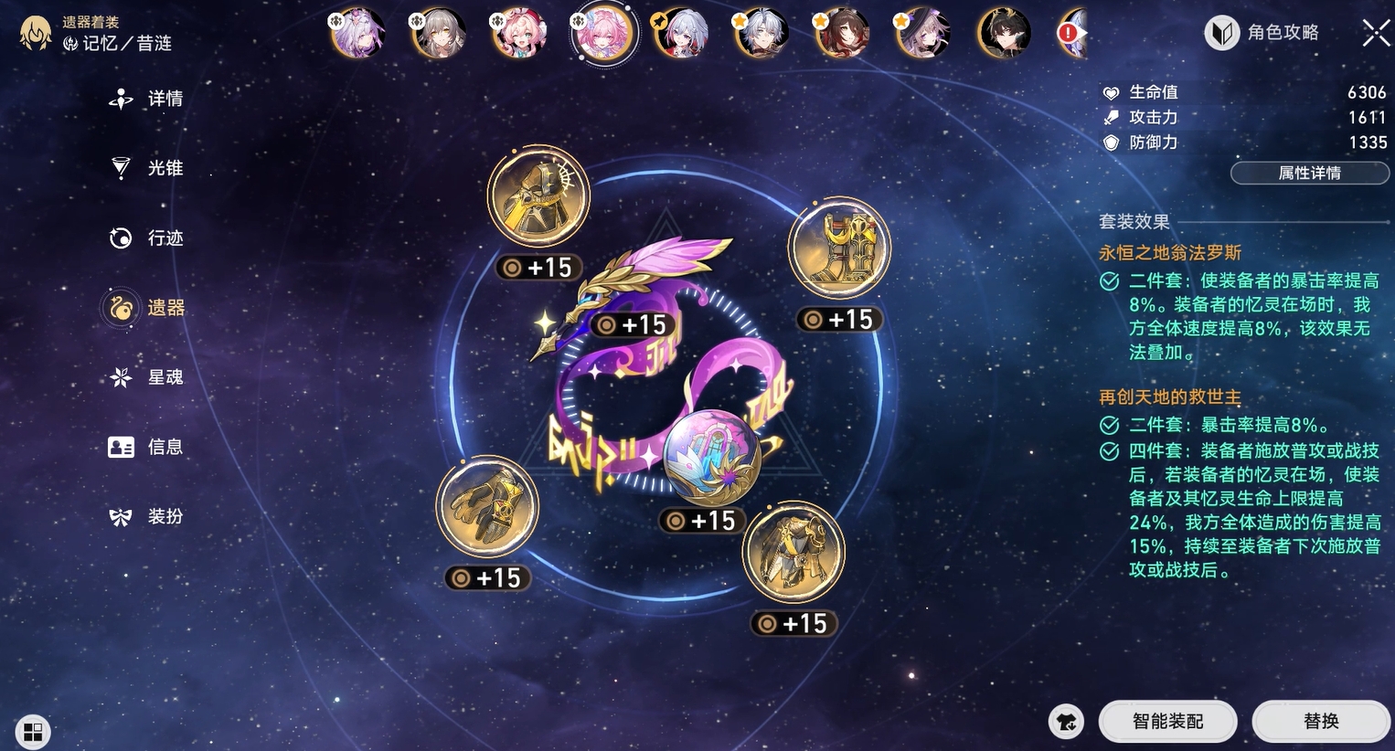 实战中,昔涟最适配的队友自然是遐蝶、长夜月和风瑾,其次是白厄、星期日、丹恒腾荒。若玩家有二命昔涟,那她在非黄金裔队伍里也能快速开出大招,可进入大多数主流队伍承担辅助位。配装上,优先考虑昔涟专属光锥,其次是模拟宇宙记忆光锥,遗器可用救世主四件套搭配翁法罗斯两件套,衣服选爆伤,鞋子选速度,球选生命或冰伤,链子选生命百分比,副词条优先考虑速度,争取将昔涟速度提至180吃满被动,其次考虑生命百分比和爆伤词条。