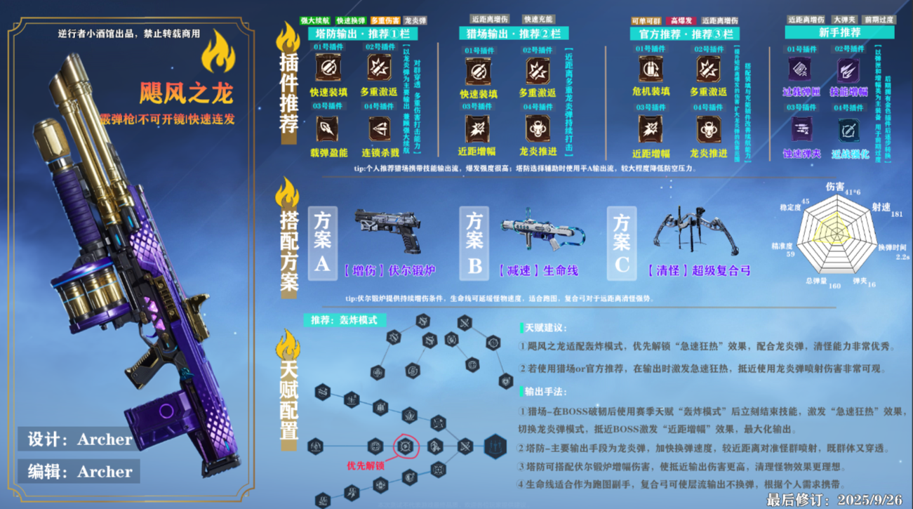 所以在天赋方面更推荐易于上手的“轰炸模式”,要点开关键天赋“乘胜追击”,可是我们受益于急速狂热的射速提升,不消耗子弹效果,使龙炎弹效果发挥更大效果。