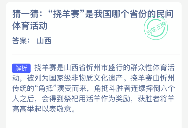 猜一猜:“挠羊赛”是我国哪个省份的民间体育活动?【蚂蚁新村每日一题】2025年11月24日题目已发布!坚持答题,积累木兰币,即可加速小镇建设。答对本题,立即可享“产速+3/时”的加速奖励!今天正确答案是【山西】。挠羊赛是山西省忻州市盛行的群众性体育活动,被列为国家级非物质文化遗产。