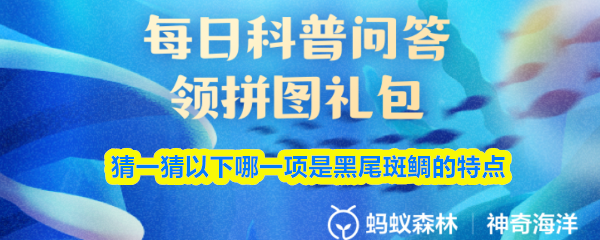 猜一猜:以下哪一项是黑尾斑鲷的特点?【神奇海洋】11月24日新题目已开答!正确答案现已公布,点击领取拼图,一起为修复海洋生态贡献力量!今日正确答案是:【尾巴上有黑色斑点】。黑尾斑鲷是一种常见的海水鱼类,其最显著的标志是尾鳍上有一个巨大的黑色斑点,该物种也因此得名。