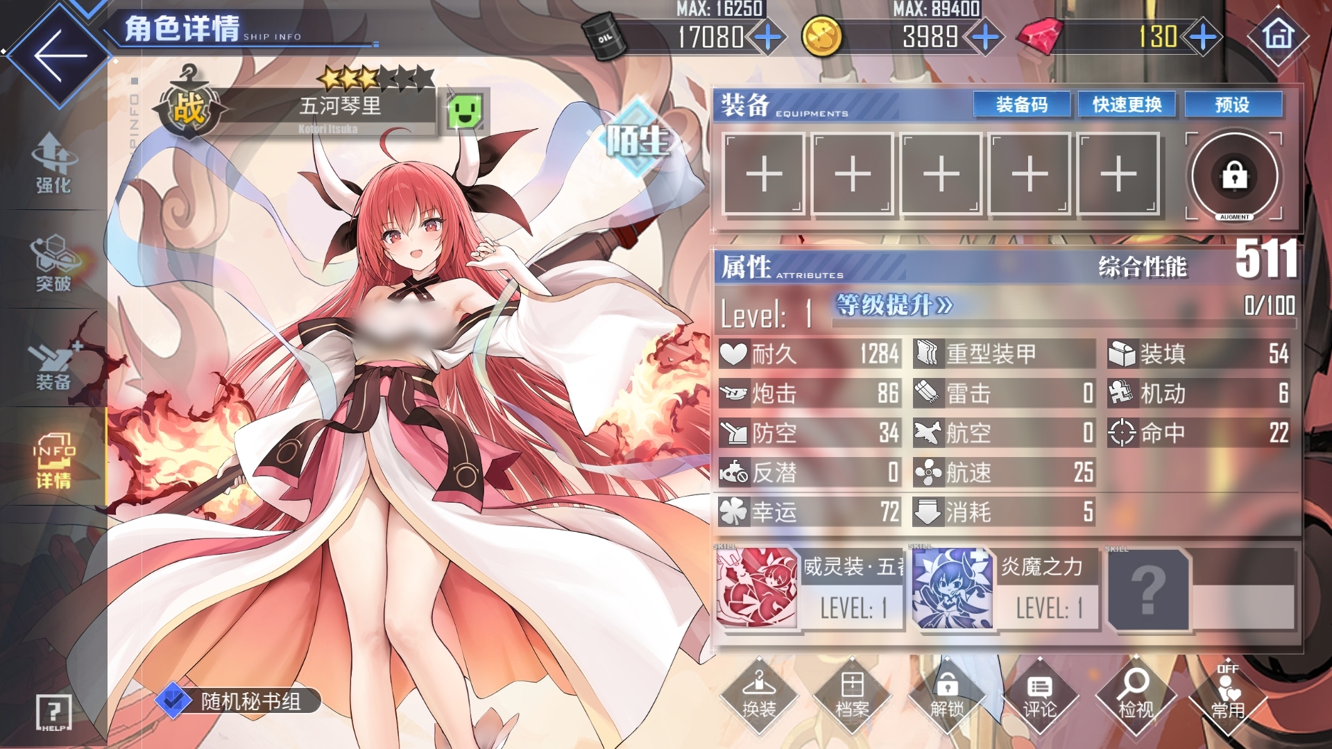 另一技能炎魔之力可在未装配专属兵装时,令五河琴里受到的点燃伤害降低,自身受到致命伤害还能回避掉本次的攻击,同时让自身进入持续10秒的无敌时间,但每场战斗只会发动一次,而且每当敌军舰船进入自身防卫范围内后,五河琴里还可获得减伤被动。可见,五河琴里能凭借炎魔之力这一技能,让自身拥有极强的生存能力。在装备了专属兵装后,炎魔之力技能还能进化,可提升五河琴里自身的炮击值和防空效果,更能在触发致命伤回避后为自己回复耐久。