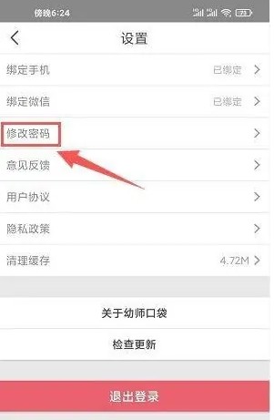 幼师口袋app怎么修改密码,在手机上打开【幼师口袋app】,进入首页后,点击【我的】按钮,点击页面右上角【设置】按钮,在设置页面,找到【修改密码】栏目,在修改密码页面,填写当前密码、新密码,点击【确定】按钮。