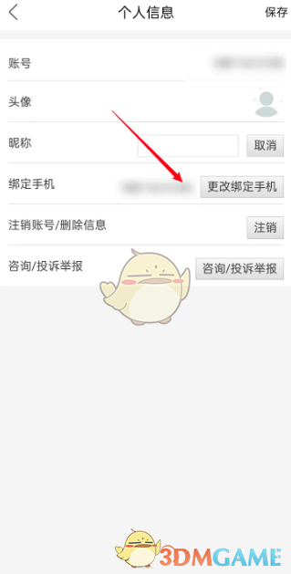 2、进入个人信息菜单栏中,点击更改绑定手机按钮。