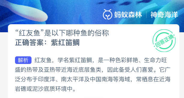 “红友鱼”是以下哪种鱼的俗称?【神奇海洋】11月26日新题目已开答!正确答案现已公布,点击领取拼图,一起为修复海洋生态贡献力量!今日正确答案是:【紫红笛鲷】。红友鱼,学名紫红笛鲷,是一种色彩鲜艳、生命力旺盛的热带及亚热带近海近底层鱼类。