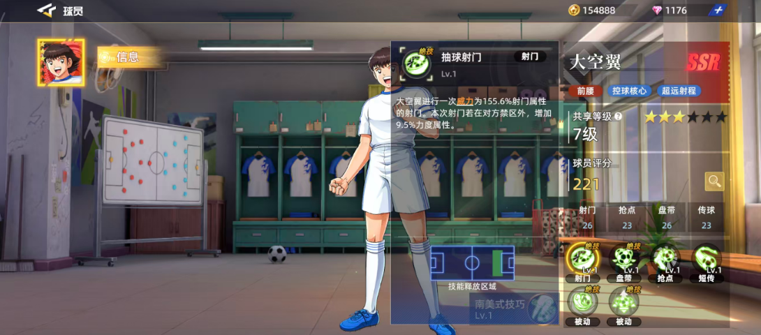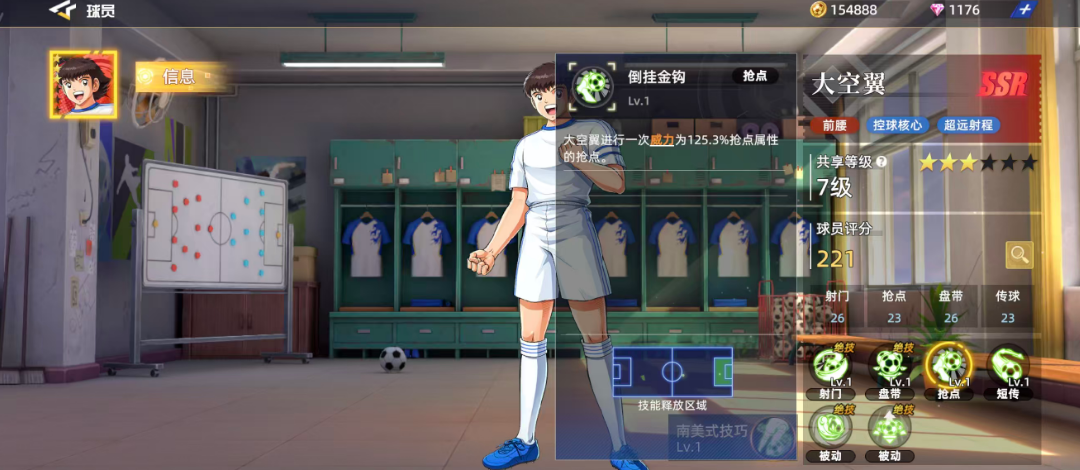 大空翼作为其中强度一骑绝尘的SSR品质角色,游戏单证的球员评分也是最高的,直接达到了221的总体评分,目前大家是很难在游戏当中看到超过200的总体评分数值的,而在这里大家可以看到他在其中可以作为前腰位置上啊的球员使用,带来的控球效果一般都是作为团队核心使用的,且也可以给球队带来超远的射程,这样在球场当中可以涉及到的技能区域就比较多了。