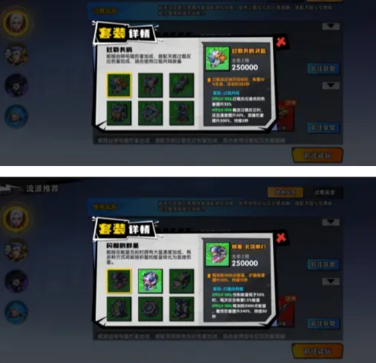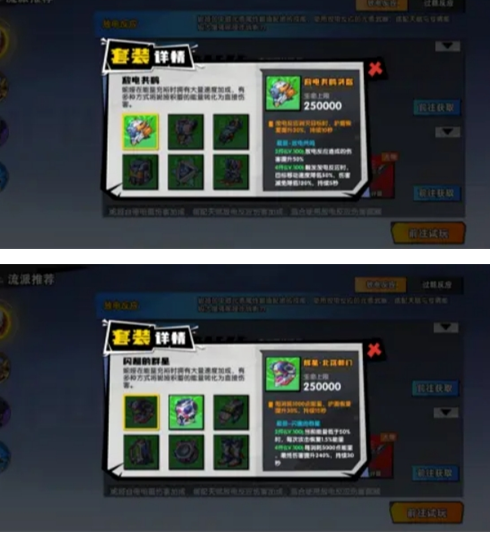 装备由2件 4件组合成套装属性,分别为两套:放电套,辉星套。每件的特殊属性不一样,推荐搭配:放电头盔,放电背包,辉星衣服,辉星护手,辉星心核,辉星鞋子。套装60级解锁,60级之前挑等级高加伤害的装备过渡。