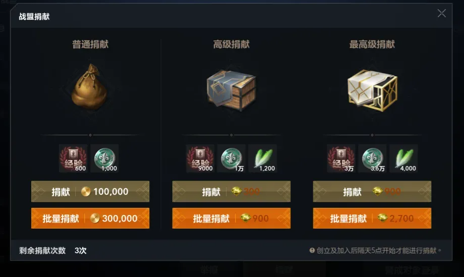捐献每日至多3次,最基础的是金币捐献,每次10万金,完成后可以获得战盟经验以及名誉勋章!