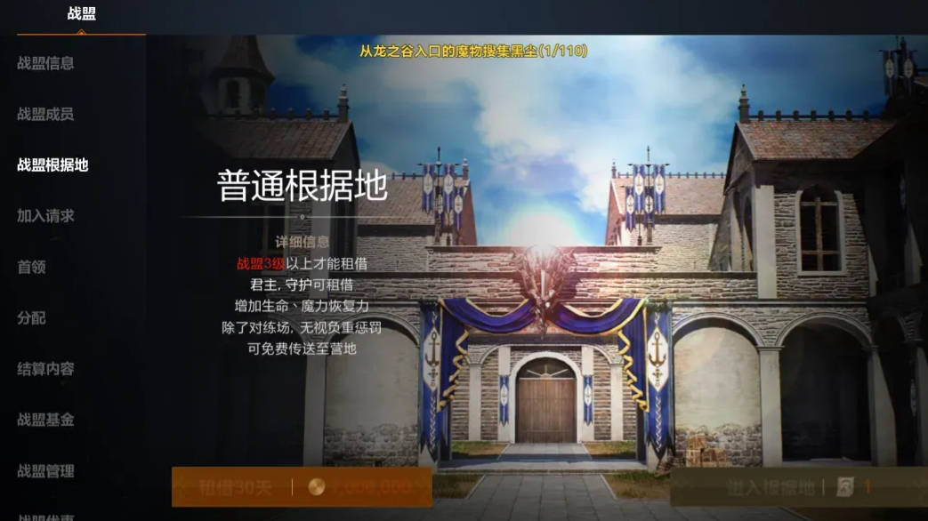 战盟等级达到3级后,战盟的君主以及守护者有资格购买战盟根据地!在战盟根据地中,成员回复生命以及魔力的速度更快哦~