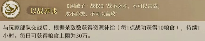 严刑明赏所带来的效果就是让队伍中三个武将的体力恢复到60点。前期开荒、打怪以及野外练级的时候非常重要,能够给玩家争取到先机,拉大与敌人的距离。技能释放后马上生效,虽然有24小时的冷却时间,但是对于前期的资源争夺很有帮助。而以战养战的目的就是用战斗来获得资源的补充。敌军交战之后,根据玩家的战功来决定是否给与相应的粮草奖励。每取得一次战斗功勋就可以兑换十石粮食,开启后可以持续一个小时,八个小时之后就会冷却。战功高的高战玩家获得的资源补给也越多,保证了快速扩张以及兵力补充的持续进行。