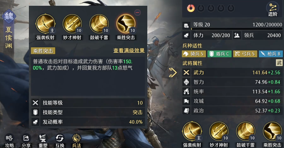然后同时的话,再带一个这个乘胜出击的话,利用他的技能在这个对目标造成伤害时候,并可以回复13点怒气,这个虽然是突击效果,但是由于大家阵容里面带了张辽,根据他的这个自带技能,是自身行动使有20%的概率达成连击状态,且在连击状态的话就可以提升15的武力,那么连击状态大家也都知道,就肯定就是再打一次,打两下的效果就是会给夏侯渊提供更多的突击可能。