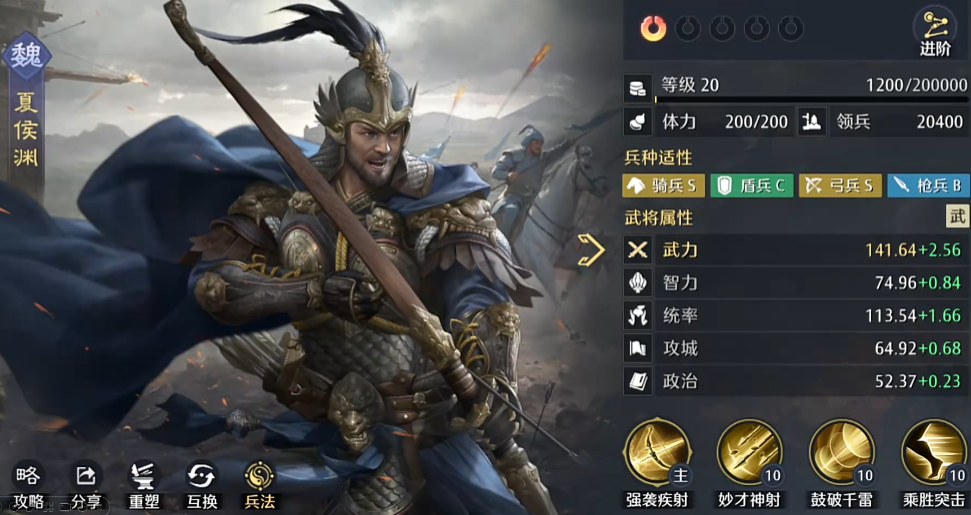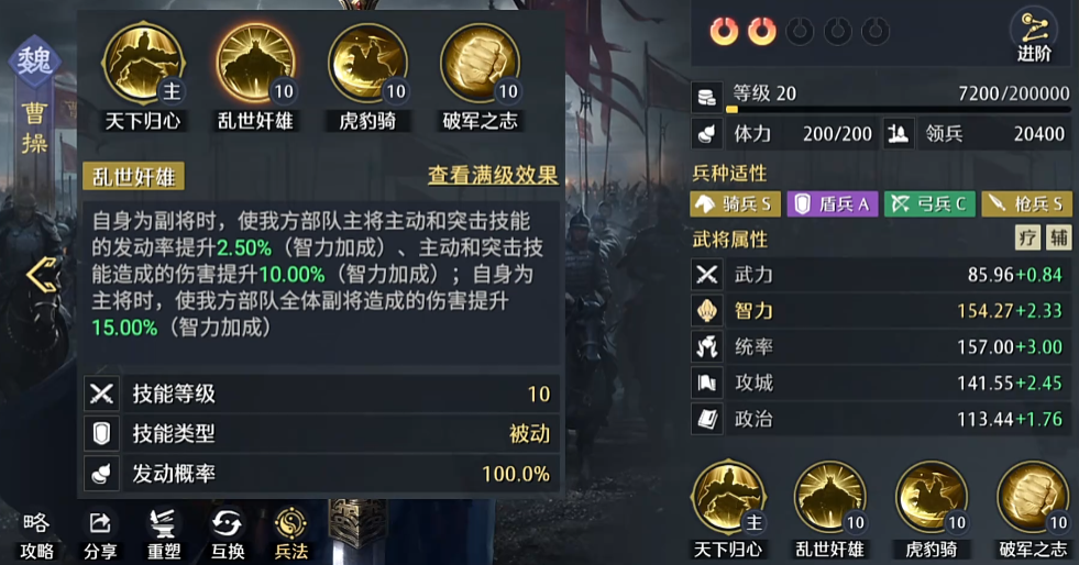 然后在背后也可以让曹操的技能派上用场,因为曹操他自己的自带技能是可以提升这个我方部队的主动战法和突击技能的发动概率,这虽然提升的效果不是很高,但是后面的主动战法和突击战法的伤害会提升10%,这个其实很厉害,就等于原来夏侯渊的伤害已经提升了40%的情况下,还能再加10%,提升50%,然后同时携带虎豹骑还能触发高概率的突击,和技能的伤害,然后曹操同时还能提升这个部队在地图当中的移动效率。