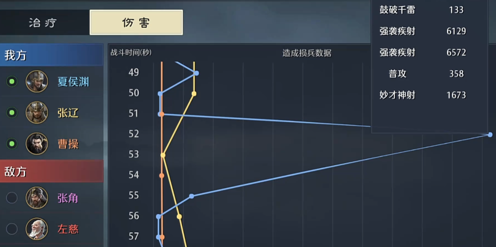 张辽的这个技能携带的话,基本上就是主要以这个给夏侯渊提供输出跳板的,然后曹操的话同样也是一个辅助去给这个主C提供收益的存在,所以输出就全靠夏侯渊去打,那么这套阵容的话,他单次的伤害就是经常也可以打出来这种一万二三左右的伤害,然后而且他的输出频率其实是非常高的,很多队伍里面这个是能单次伤害基本上达到非常高的一个效果的同时,还能在在就是正常的这种输出轮次当中,打出来很多这种低阶段的伤害。