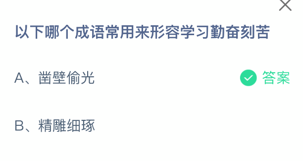 以下哪个成语常用来形容学习勤奋刻苦?支付宝小鸡课堂开课啦!每天花一分钟答题赚饲料,喂喂小鸡就能贡献爱心啦!轻松又意义十足!2025年12月2日蚂蚁庄园的小鸡课堂题目正确答案是【凿壁偷光】,西汉匡衡凿穿墙壁引邻舍之烛光读书。后用来形容家贫而读书刻苦。