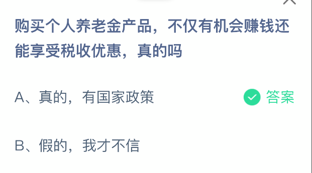 购买个人养老金产品,不仅有机会赚钱还能享受税收优惠,真的吗?支付宝小鸡课堂开课啦!每天花一分钟答题赚饲料,喂喂小鸡就能贡献爱心啦!轻松又意义十足!2025年12月3日蚂蚁庄园的小鸡课堂题目正确答案是【真的,有国家政策】,购买个人养老金产品确实有机会实现财富增值并享受税收优惠,这是国家政策明确支持的。
