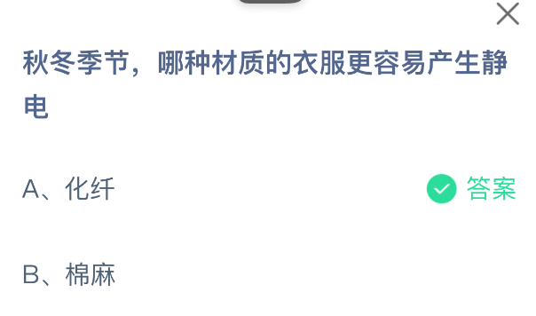 以上就是秋冬季节,哪种材质的衣服更容易产生静电,支付宝蚂蚁庄园2025年12月3日答案最新,更多精彩内容,请点击关注3DM手游网更新!
