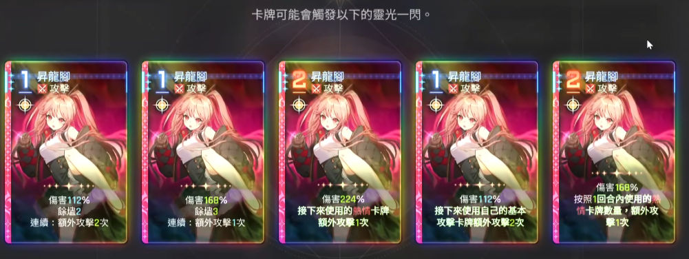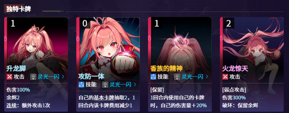 对于梅铃来说,这样的强化卡都是有两张的话,在输出潜力上面就会更强,而升龙脚这张卡的话,对于梅铃来说,作为一张1费的攻击卡,其实输出能力是比较一般的,但是带的状态加成还是比较好用的,如果是用了其他卡牌之后再用这张卡,周围出现的提示也会有一定的连击效果可以触发,这里的话大家可以默认为这里的连击次数会直接翻倍,但是不会进行重复叠加上面的层数,所以通过灵光一闪的变体后期,梅铃可以获得很多的额外输出机会。