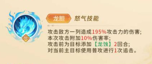 而且在赵云的核心输出效果上面,他有怒气技能可以进行使用,那么在使用这个东西技能的时候,他来带来的效果当中,一般情况下是可以攻击一列敌人的,攻击成功的时候,还可以给敌人带来195%的伤害数值,其次附加的10%伤害率还可以根据他们龙蚀状态来为敌人增加一定的状态加成,目前当前目标是普攻的时候,他带来的效果就可以进行一次追击,所以目前赵云他刚才阵容里面使用的话,是非常适合用链接效果使用的,因为他很多的技能机制里面,主要就是触发他足够的连击次数,大家可以以这样的叠加方式增强他的输出能力。