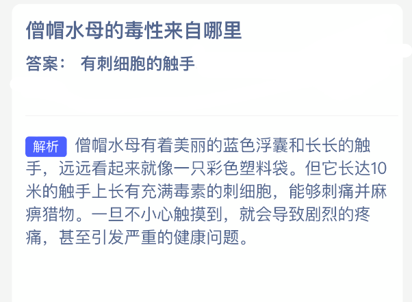 以上就是僧帽水母的毒性来自哪里?神奇海洋今天答案最新2025年12月3日分享,更多相关攻略内容,请点击关注3DM手游网更新!