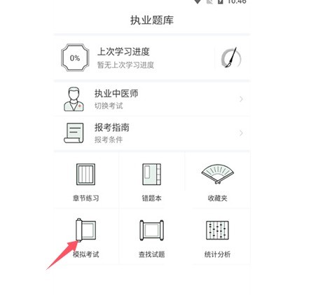 中医通app怎么进行模拟考试,打开中医通APP,在主界面中找到并点击【执业题库】图标,进入题库功能页面,在题库页面中,选择【模拟考试】选项,点击进入后即可开始模拟考试。