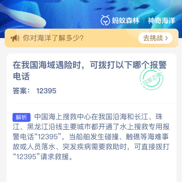在我国海域遇险时,可拨打以下哪个报警电话?【神奇海洋】12月7日新题目已开答!正确答案现已公布,点击领取拼图,一起为修复海洋生态贡献力量!今日正确答案是:【12395】。中国海上搜救中心在我国沿海和长江、珠江、黑龙江沿线主要城市都开通了水上搜救专用报警电话“12395”.