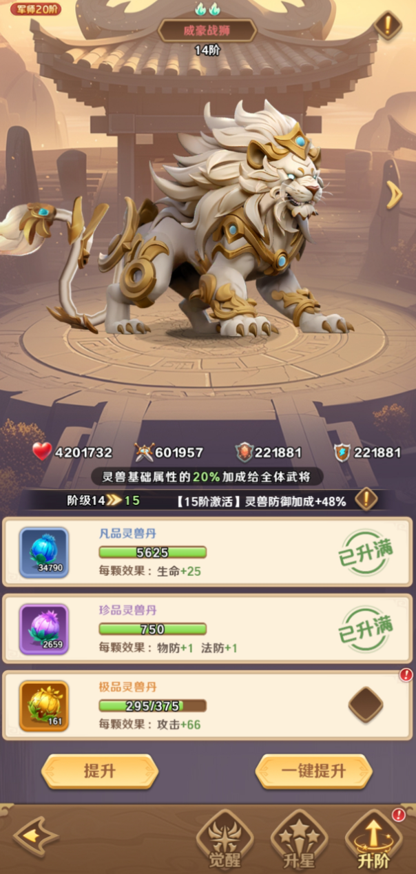 豪威战狮:在游戏前期的时候,玩家倒是可以选择这只灵兽,因为它作为全能型的输出类型的灵兽。在战斗的时候,它可以直击战斗核心的痛点,一旦施展技能之后,就可以给整个武将提供怒气值的加成。额外也可以让伤害,暴击率以及爆伤等等方面的提升。其实对于他的出现,往往能够让整个队伍的实力增强。不过对于玩家来说,在资源分配方面的话,可以直接将豪威战狮提升到6星,然后就能够解锁被动技能,再合理的运用它。