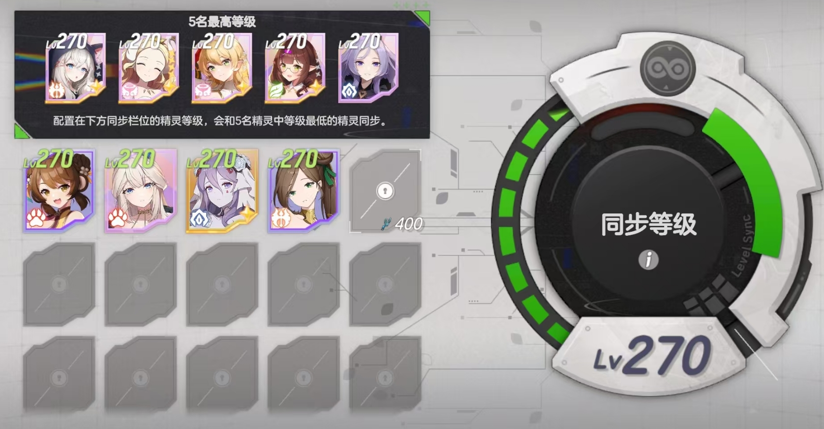 召唤劵能让玩家们从卡池里抽取到多位风格各异的精灵少女,她们都可通过养成来提高战力,并且游戏开放了同步等级功能,玩家只需放置五名等级最高的精灵少女,然后将需要升级的精灵放到同步栏位,游戏会立刻让该精灵的等级与五名放置精灵少女同步。但要注意,同步时最高能提升的等级会以五名放置精灵中等级最低的为基准,因此玩家最好让五名精灵少女都保持同一等级。
