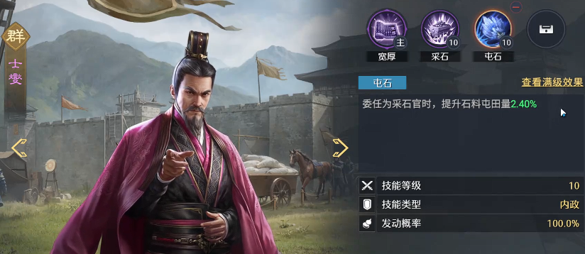 前期其实在石头类,或者各种粮草资源是很缺的,那大家可能跟前面开荒开的快的玩家相比就是差在了主线任务的速度上,那过主线任务可能就是卡石头,或者卡个粮草都是有可能的,这里小编给大家分享一个能多拿屯田的方式,大概每次都能多四五天的产量,大家想要用这个方法的话,首先要知道这个游戏当中是内政官的,内政当中有采石官,那大家就可以把这个采石官的内政给点上,同一个田的产量都会有很多的增加量,比如大家囤一次就是1928,大家通过内政官把他的这个技能全给点满,然后在产出上面就会有1000多的差别,那么大家此时还可以做一个操作,就是在屯田的时候,就把这个技能给它点满,然后比如说不点了,就是大家拿到想要的资源了,再把之前给内政官用的升级资源给收起来。