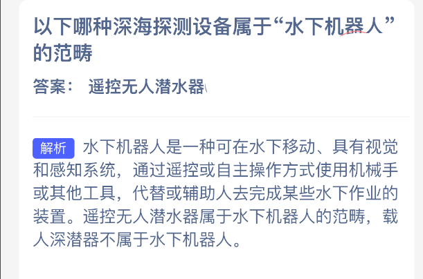 以上就是以下哪种深海探测设备属于“水下机器人”的范畴?神奇海洋今天答案最新2025年12月12日分享,更多相关攻略内容,请点击关注3DM手游网更新!