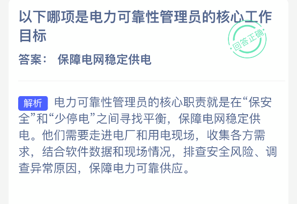 以上就是以下哪项是电力可靠性管理员的核心工作目标?支付宝蚂蚁新村最新答案2025年12月16日,更多精彩内容,请点击关注3DM手游网更新!
