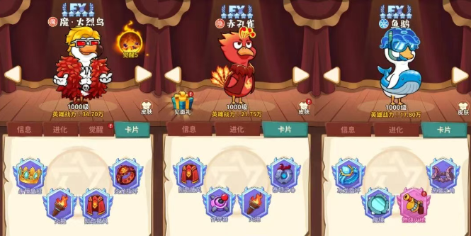 3、神冲鸭:挂上元素弱点,增加火队的输出(最好是将神冲鸭的攻击力拉成全队最高,让小帅鸽的回合能给上神冲鸭),通过搭配不同品质的卡牌等;