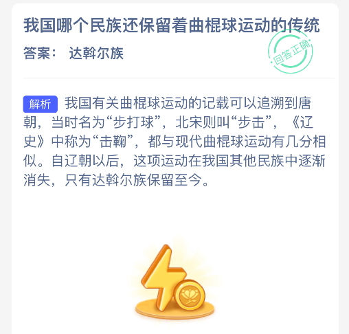 我国哪个民族还保留着曲棍球运动的传统?【蚂蚁新村每日一题】2025年12月17日题目已发布!坚持答题,积累木兰币,即可加速小镇建设。答对本题,立即可享“产速+3/时”的加速奖励!今天正确答案是【达斡尔族】。我国达斡尔族至今仍保留着曲棍球运动的传统。自辽代以后,这项运动在我国其他民族中已逐渐消失,唯有达斡尔族将其传承至今。