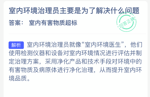 室内环境治理员主要是为了解决什么问题?【蚂蚁新村每日一题】2025年12月18日题目已发布!坚持答题,积累木兰币,即可加速小镇建设。答对本题,立即可享“产速+3/时”的加速奖励!今天正确答案是【室内有害物质超标】。室内环境治理员主要致力于解决室内环境中存在的各种污染问题和健康风险,以创造安全、健康、舒适的居住和工作空间。他们的工作核心是识别、评估并消除或控制室内环境中的有害因素。