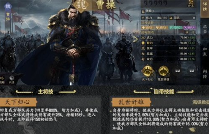 曹操的核心优势在于其被动“反戈一击”:每次受到普攻或战法伤害时,可对攻击者造成基于自身防御力的固定比例反伤;随着战法等级提升,该效果的触发概率与伤害倍率同步增长。这一机制使其既能承担前排承伤职能,又能持续输出压制,进可主C,退可辅控,在多套体系中均具备不可替代性。本文重点推荐两套经大量实战验证的成型阵容——反击流与毒奶流。