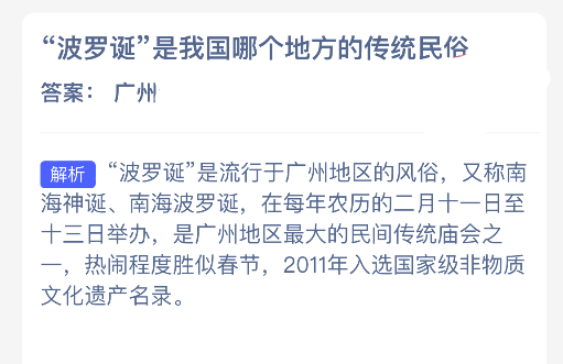 “波罗诞”是我国哪个地方的传统民俗?【蚂蚁新村每日一题】2025年12月21日题目已发布!坚持答题,积累木兰币,即可加速小镇建设。答对本题,立即可享“产速+3/时”的加速奖励!今天正确答案是【广州】。“波罗诞”是流行于广州地区的风俗,又称南海神诞、南海波罗诞。