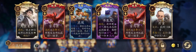 而要想玩转帝国紫府电表阵容,关键在于早一些完成天书升级,拿到虎侯和紫府老君,随后每回合尽可能地去提升虎侯的能力,并令紫府老君的能力与他进行联动,使虎侯的效果能多次触发,这样一来帝国部从的数量会增加得非常快,战力自然就能升得很高。尤其在最后决战时,若玩家手上还捏着一把皇恩或是可为虎侯提供皇恩效果的牌,还能一次性全部用出,令虎侯增加部从数量的效果和紫府老君次数限制效果额外发动一次的能力频繁触发,使阵容的战力产生质变,打对手一个猝不及防。