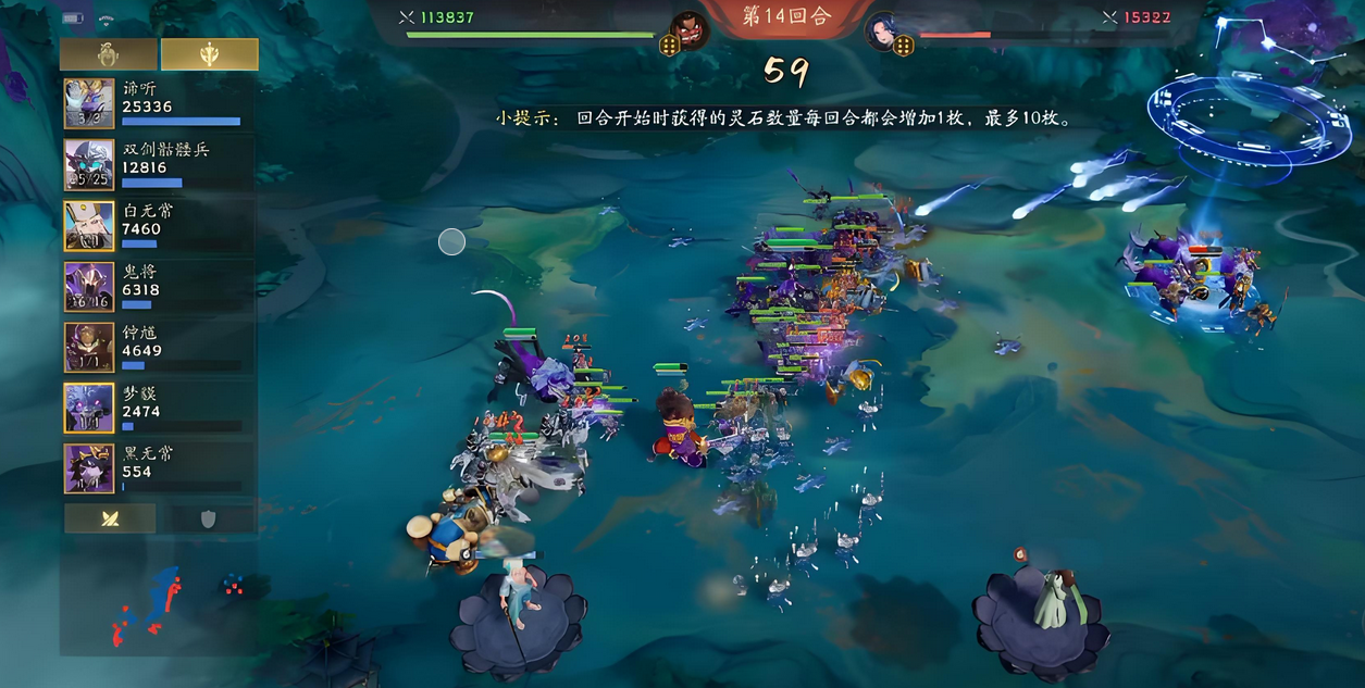 运营节奏需严格分阶段执行:开局使用阴兵过渡,该单位每回合结束自动产出瘴气,并可触发鬼将技能,额外生成战士单位;进入中期后,优先补足奈何桥守卫与五岳卫兵——前者直接提升战士数量上限,后者与小鬼形成联动加成,显著提升成长效率。需特别注意,小鬼既是可参战的特殊部从,也是召唤阎罗的唯一资源,同时具备出售回血功能,因此在前期应主动寻找击杀窗口,高效利用阴兵等效果积累瘴气,建立属性优势;中期则聚焦部从等级提升与装备成型,此时瘴气转化效率跃升,整体战力达到峰值,应果断推进扩大战果。