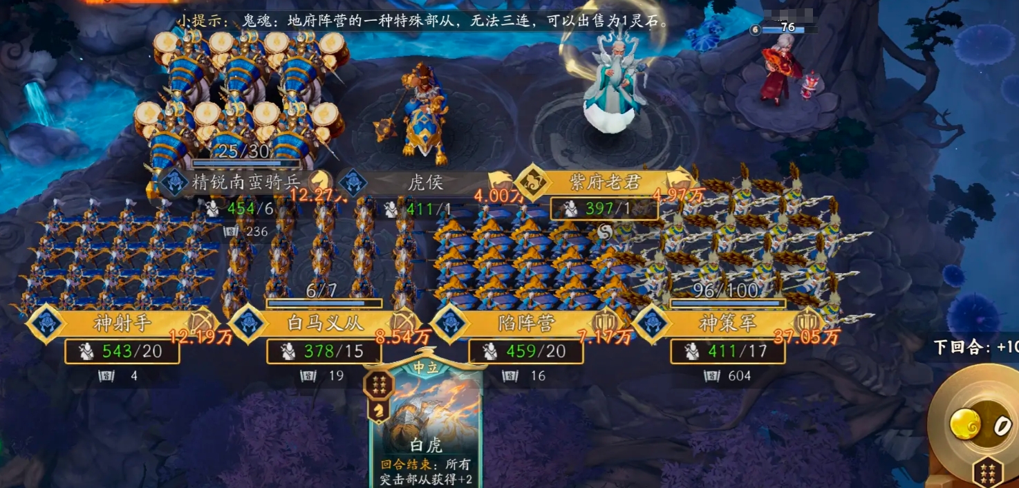 实战运营的关键在于节奏把控。前期需优先推进天书升级进度,确保尽早获取虎侯与紫府老君。在此基础上,应有意识地保留皇恩资源,避免过早耗尽;中期通过始皇帝等辅助角色提升皇恩获取效率(其效果为每张皇恩牌额外提供1点皇恩),从而降低虎侯启动门槛。进入中后期后,集中调度手牌中的皇恩与供能卡牌,在单回合内密集触发虎侯效果,配合紫府老君的次数补正,往往可在一回合内完成6个及以上部从的批量数量增幅,瞬间扭转战场态势。