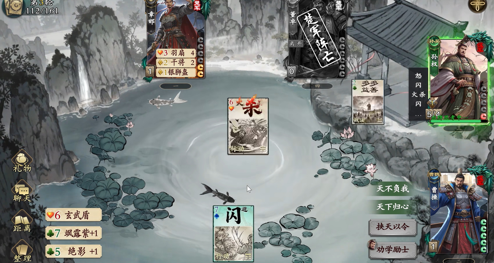 第三技能“枭雄之资”提供高额战利品转化能力:每当曹操击杀一名其他角色,即可全额收缴其未使用的全部手牌及已装备在装备区的所有牌,并将其纳入自身手牌区继续使用。这一机制极大强化了中期爆发上限——尤其在成功击杀携带多张【杀】、【闪】或关键锦囊的对手后,曹操往往能立即衔接多轮连续攻击,实现火力再分配与战术转向。此外,在团队协作场景下,队友亦可通过主动牺牲方式,将关键牌组集中转移至曹操手中,助其快速完成关键轮次的爆发输出。