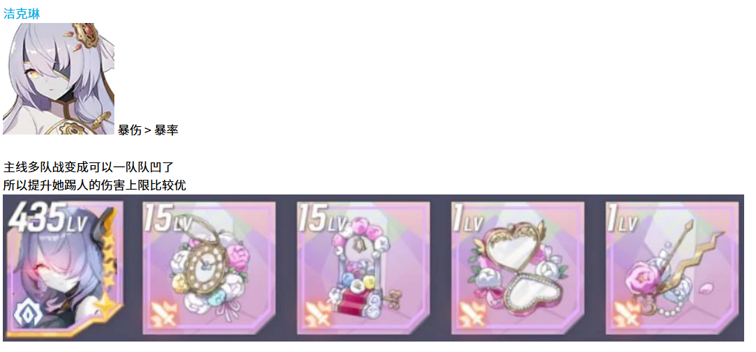 洁克琳的玩法比较特殊,她的踢人技能在多队战里非常实用。随着主线关卡可以慢慢磨了,提升她单次伤害的上限变得更重要。所以暴击伤害必须拉满,暴击率稍微补一下就行。这样配出来的洁克琳才能在关键时刻一脚把敌人踢出场,给队伍腾出空间。