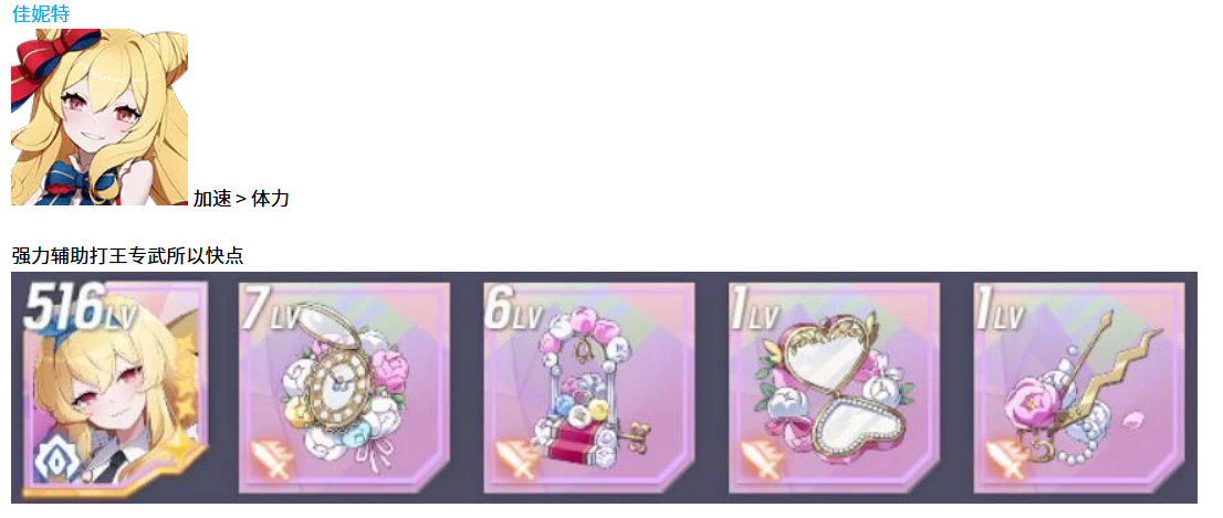 佳妮特作为辅助型精灵,配装的核心是让她尽快放出增益技能。加速属性必须优先堆,体力其次保证她的生存能力。毕竟辅助死得太快的话,后面的战斗就很难打了。专武的效果搭配高速度,能让整个队伍的输出环境变得更好。