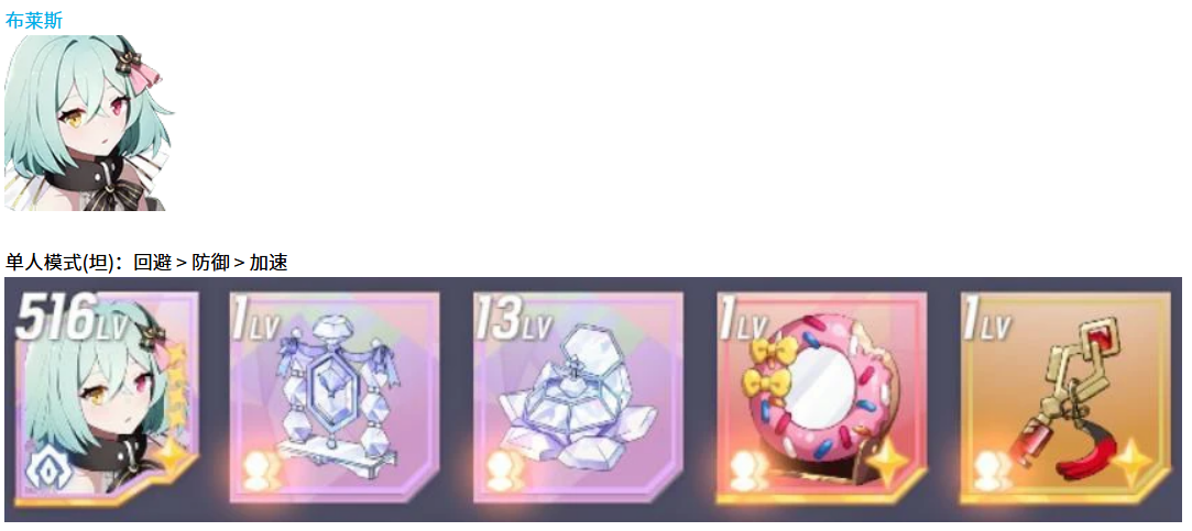 布莱斯同样有两套配装方案。当坦克用的话,回避是核心属性,防御和加速作为补充。推图容易被秒的情况下,高回避能大幅提升存活率。如果队伍需要她输出,比如打黑骑士首领的时候,就换成暴击伤害加攻击力的装备,表现会好很多。