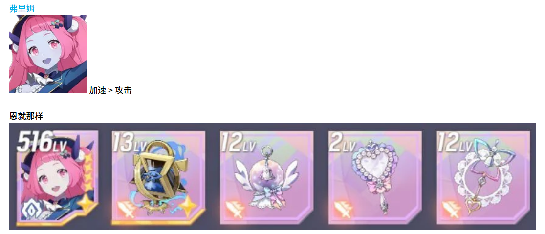 弗里姆这个角色说实话没什么特别要注意的地方。加速能让她更快释放技能,攻击力保证基础伤害够用。配装上不用想太复杂,按这个思路来就差不多了。