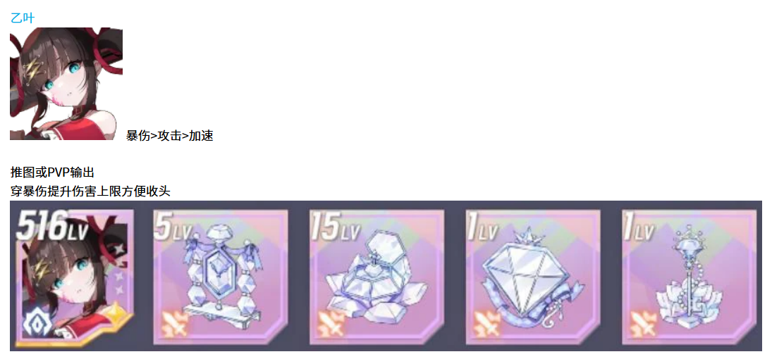 乙叶在竞技场和推图里都是很强的输出角色。暴击伤害依然是首选,攻击力和加速根据实际情况分配。她的收割能力很出色,高伤害能更稳定地收掉残血目标。不过在恶灵讨伐这个模式里,建议优先堆加速,因为她的被动技能需要快速触发才能打出斩杀效果。速度上去了,斩杀的机会就更多。