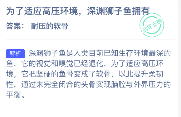 为了适应高压环境,深渊狮子鱼拥有?【神奇海洋】12月25日新题目已开答!正确答案现已公布,点击领取拼图,一起为修复海洋生态贡献力量!今日正确答案是:【耐压的软骨】。为了适应高压环境,深渊狮子鱼拥有耐压的软骨。
