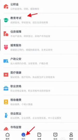 实名认证完毕后,找到左下方首页右侧的的便民点击进入,找到教育考试点击进入
