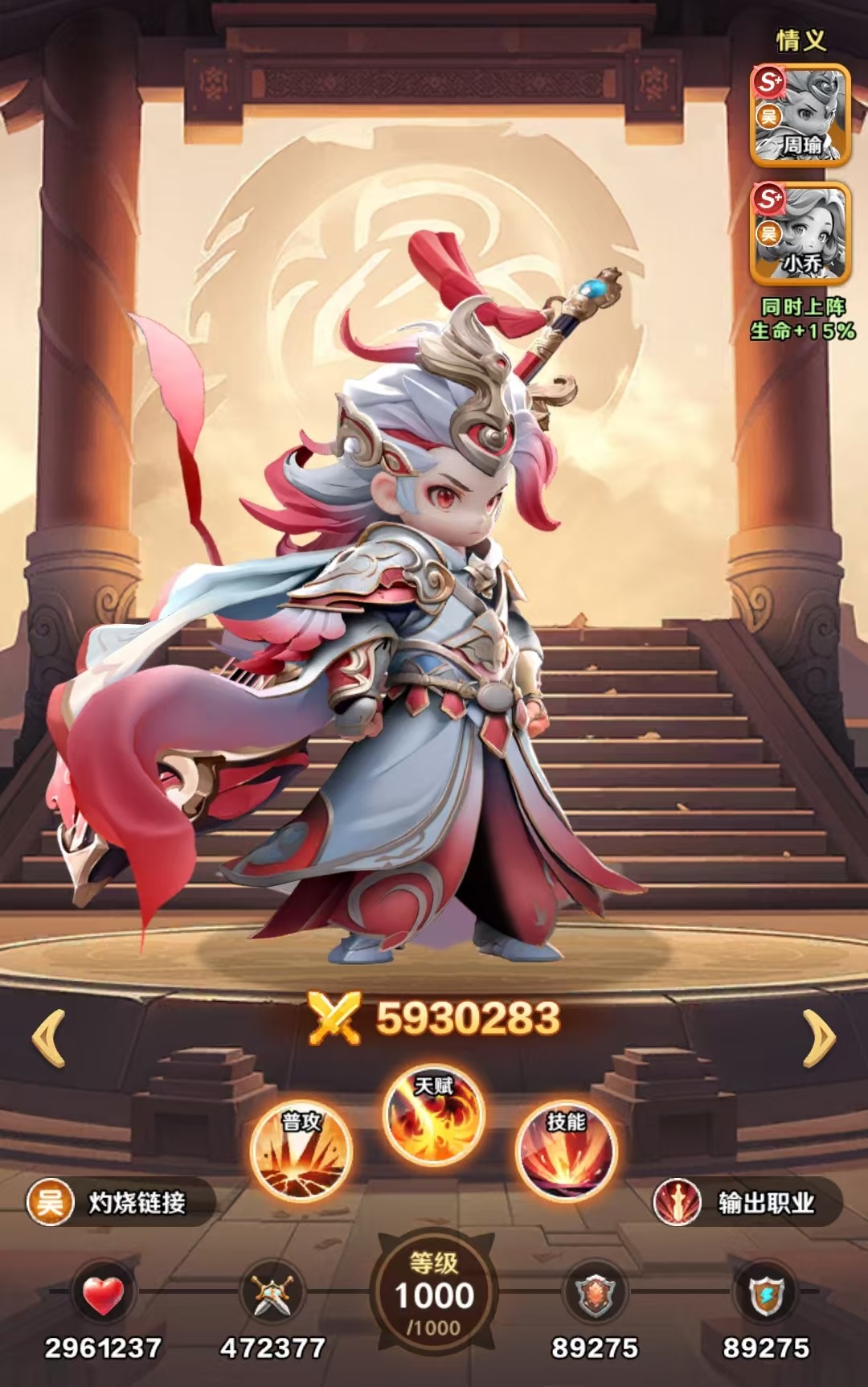 在阵容方面走的就是传统的东吴国家队,具体人选是周瑜、孙策、孙尚香、小乔、孙权和大乔。这样可以完美吃到东吴的羁绊效果,怒气联动直接拉满。这些人选中。周瑜是灼烧的核心,孙策是前排承伤的坦克,孙尚香补输出和控制怒气节奏。小乔负责治疗,孙权提供增益效果,大乔用于辅助。孙尚香偷怒过来给周瑜、孙策提供怒气,然后打出灼烧和爆发的循环。