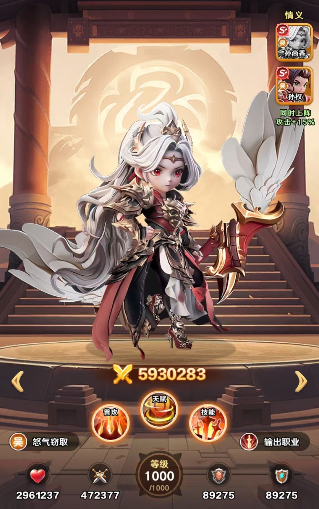 孙尚香是属于巨神军师中东吴阵营的核心武将之一,自身的定位是群体物理输出和怒气控制,既有清场能力又具有团队回怒的能力。该武将在达到九星之后才能实现质变,适配东吴灼烧体系和各个场景PVP选择。在实战中的定位就是群体物理输出,是一个比较稳定的副c兼团队的节奏选手,也是东吴国家队的刚需。孙尚香的普攻是稳定的单体伤害,小技能单体伤害比较高,积攒怒气快,大招可以攻击对方全体,除了造成物理伤害外,还有几率偷两名目标的一点怒气。这样既可以打断对方的大招,又可以加速己方循环。