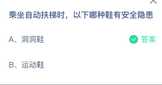 乘坐自动扶梯时,以下哪种鞋有安全隐患?支付宝小鸡课堂开课啦!每天花一分钟答题赚饲料,喂喂小鸡就能贡献爱心啦!轻松又意义十足!2025年12月28日蚂蚁庄园的小鸡课堂题目正确答案是【洞洞鞋】,乘坐自动扶梯时,【洞洞鞋】有安全隐患。