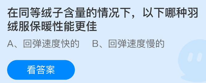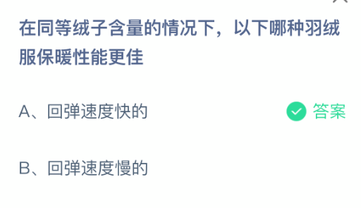 在同等绒子含量的情况下,以下哪种羽绒服保暖性能更佳?支付宝小鸡课堂开课啦!每天花一分钟答题赚饲料,喂喂小鸡就能贡献爱心啦!轻松又意义十足!2025年12月29日蚂蚁庄园的小鸡课堂题目正确答案是【回弹速度快的】,在同等绒子含量的情况下,【回弹速度快的】羽绒服保暖性能更佳。
