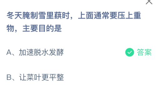 冬天腌制雪里蕻时,上面通常要压上重物,主要目的是?支付宝小鸡课堂开课啦!每天花一分钟答题赚饲料,喂喂小鸡就能贡献爱心啦!轻松又意义十足!2025年12月30日蚂蚁庄园的小鸡课堂题目正确答案是【加速脱水发酵】,冬天腌制雪里蕻时,在上面压上重物的主要目的是通过物理压力促进水分渗出,加速脱水过程。